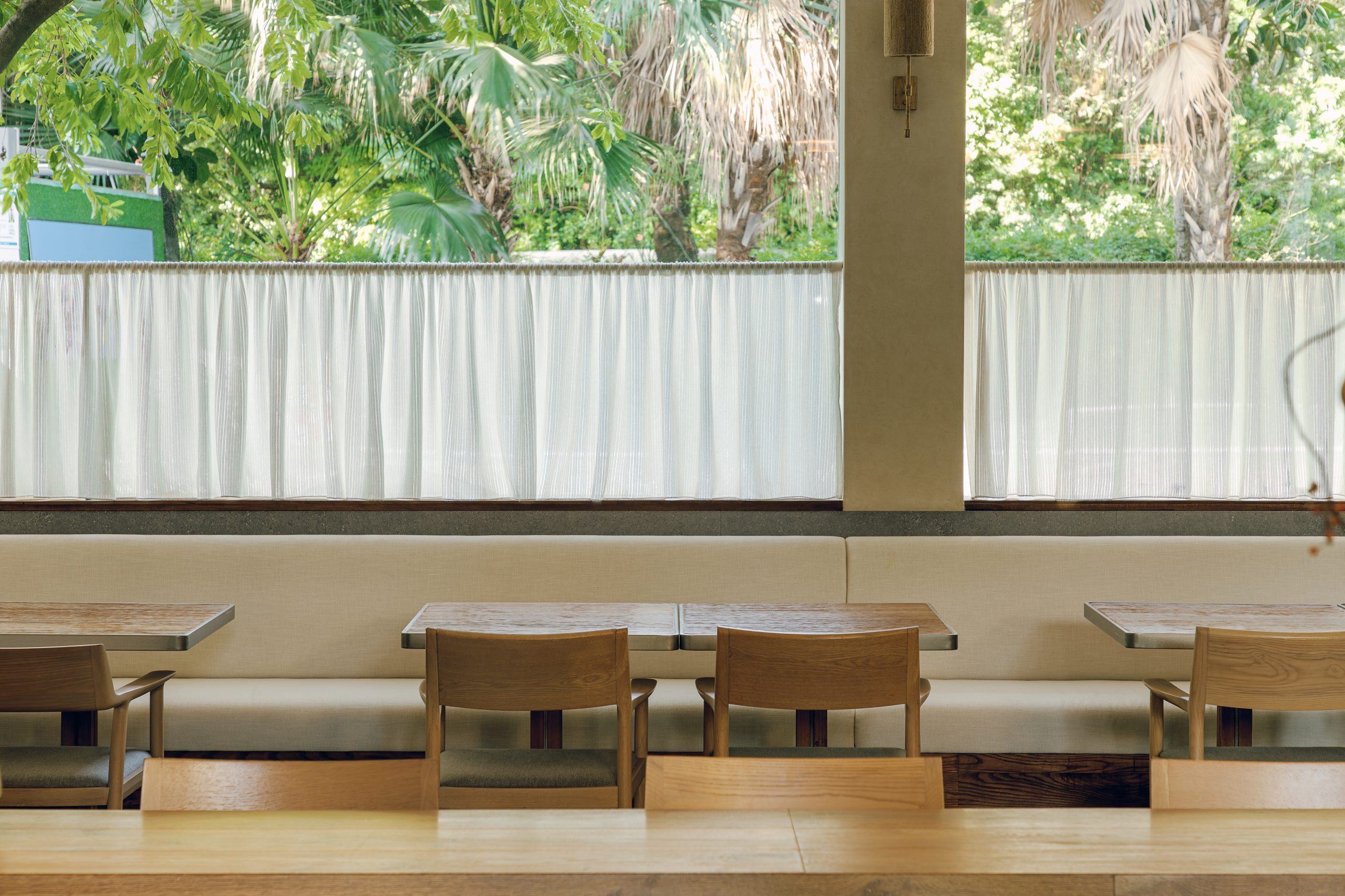 We opened the north-facing shoji windows, utilizing the existing height difference and curtains to control sightlines and framed views. This allows customers inside to avoid the view of the parking lot cars while enjoying the greenery above. Meanwhile, when looking in from outside, the sightlines are designed to bypass the dining booth area subtly concealed by curtains, offering a glimpse of the central bar and open kitchen operations. Through layered sightline control, the relatively small space gains added depth and a sense of openness.
