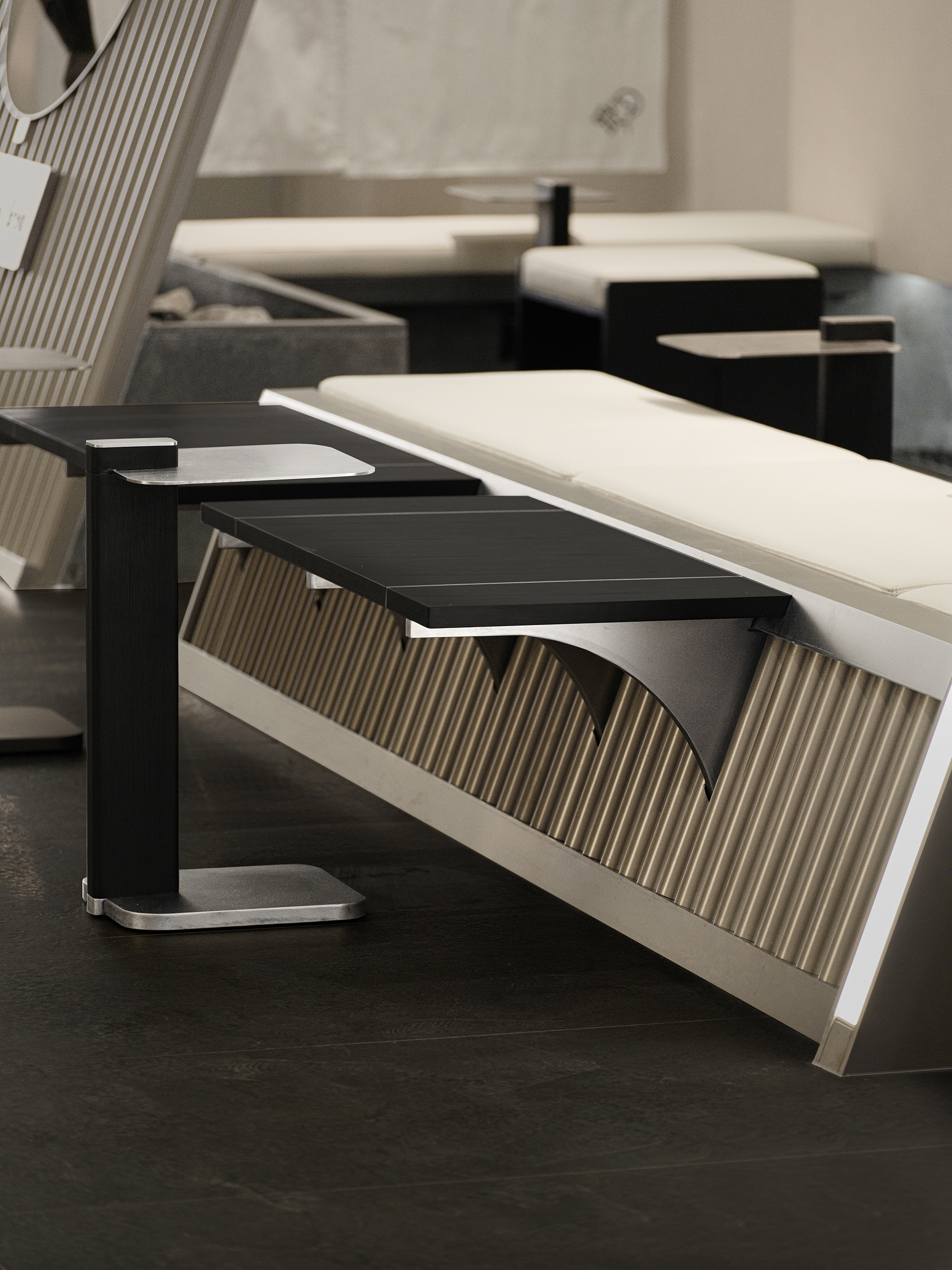 通过黑色镜面与单面水纹玻璃,去捕捉微风拂过水面的一瞬;侧面的纯平镜面与四分之一圆形光膜相映,呈现出月影初升的意境;悬垂的黑色麻绳与茶壶静静垂挂,与月影遥相对话,构成宁静雅致的画面。